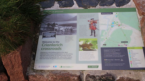 The next section of the West Highland Way was a pleasant stroll through Auchertyre. I crossed the A82 again and started a moderate climb through a forested hillside toward Tyndrum. There are some interpretive signs detailing clan history along the way.